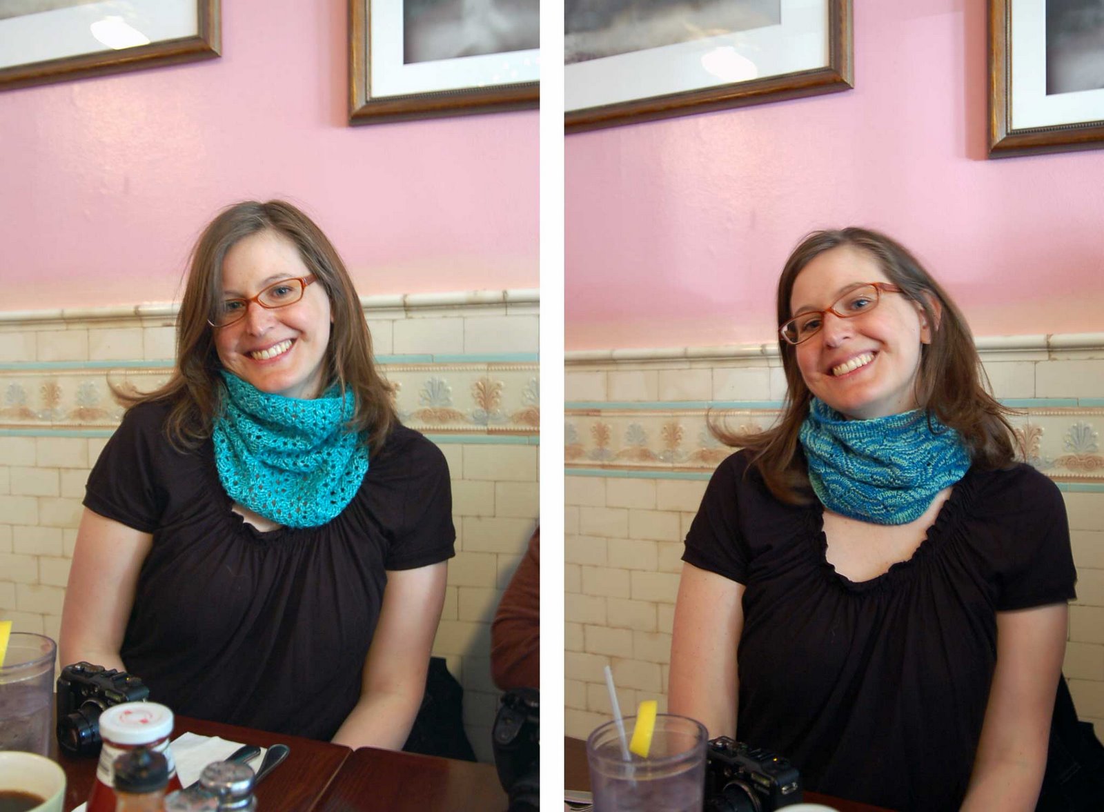 Soooooo, I thought I had taken photos of the cowls once I finished them, but apparently, all I can find on my iPhoto of the lace rib cowl are detail shots, so that’s all I’ve got for you. And my lighting made it look much greener than it does in natural light, as it looks pretty turquoise on Megan. Doesn’t she look happy wearing it?