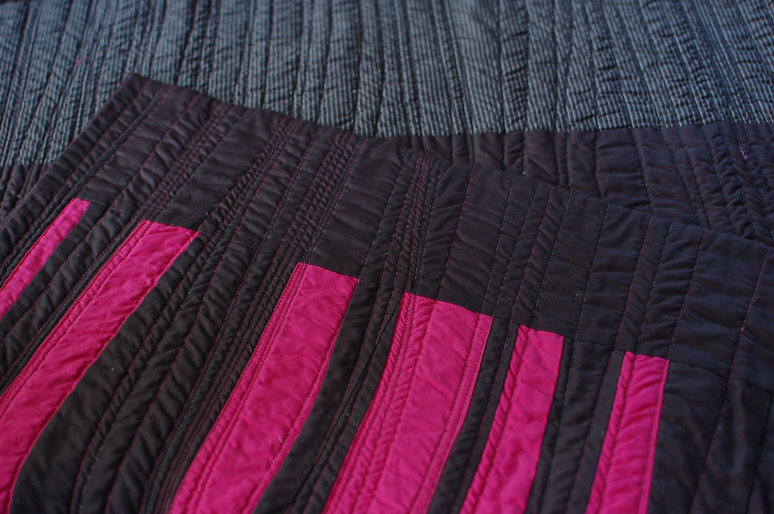 The quilting, however, is another story. I thought I would do some easy, breezy meandering lines in light gray, hot pink, and black. So much fucking puckering. Like a motherpucker. I blocked the hell out of it, but there was still so much directional wrinkling. And that’s the thing. I love shrinkly, wrinkly quilts, but a) I don’t think that was quite the aesthetic I wanted for this one, and b) it’s the directional wrinkles that bug me. On an upnote, I did my first invisible binding (awwwww! baby’s first!) and was impressed by how easy they are to do. My edges look pretty damn sweet (if you can look past the wrankling). Onwards! This project was a great learning experience, and lately, that’s what I find most compelling.
