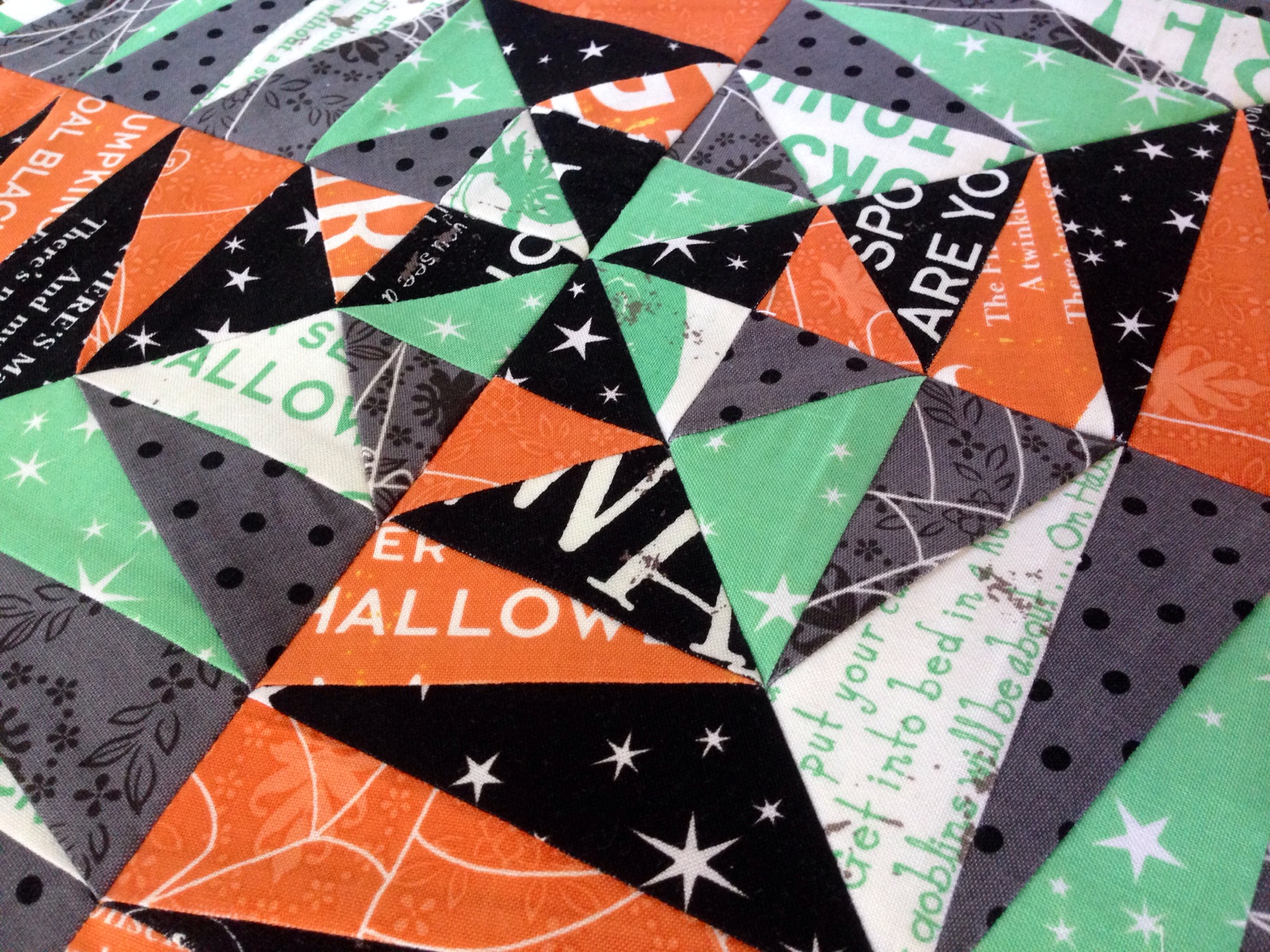 Right now, I have about 12 WIPs that I am working on this week with the intention, hope, lofty ambition, faraway dream of finishing at least one by come the weekend. I have no idea which one would qualify as my most pressing, but as far fun and engaging go, this Halloween themed version of Spun is my favorite. I did the paper piecing in one night (after the wees went to bed) and squared up and pieced it together in the morning. I’m thinking of making this the center of a Halloween themed medallion quilt. You can make your own Spun, Halloween flavored or not, with the pattern here.
