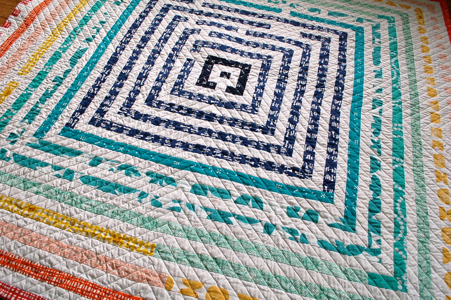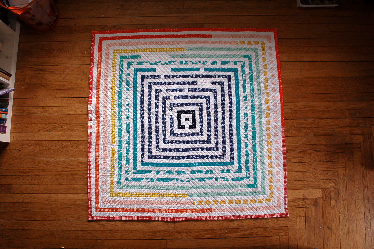I’ve been trying to finish up some quilts before starting some new ones. So far, I seem to keep starting small new projects, mainly piecework that’s easy to do from my living room at night while the kids are sleeping. What can I say? QuiltCon left me feeling super-inspired and intensely motivated. I have, however, finished off two quilts that make me pretty happy. One is this little guy here. Measuring 50 x 50 inches, it’s big enough to be a lap quilt, but I kinda want to hang it on a wall. It’s a little bit Frank Stella with a Chawne influence and the vague hint at the labyrinth which inspired me. I was sitting there watching the kids run around the labyrinth and thought that a labyrinth quilt would be fun to make. And I’ve been obsessing a bit over the works of Frank Stella lately – how easily his paintings would work as quilts, how I love his use of color, how I’d like to play with the same exploration of form and color, how his linework would translate into stitches.