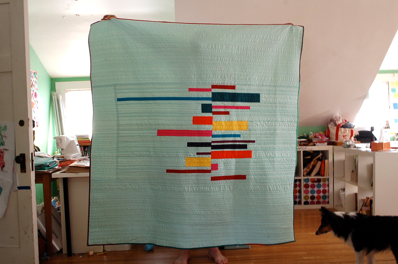 Yay! Congratulations on quilting this. I think it looks great with the horizontal quilting lines echoing the color bars. That must have taken you a good number of hours, considering how big a quilt it is. I love the photo too. The dog is about to tackle something–and I hope it’s not the quilt edge or the person’s bare feet!