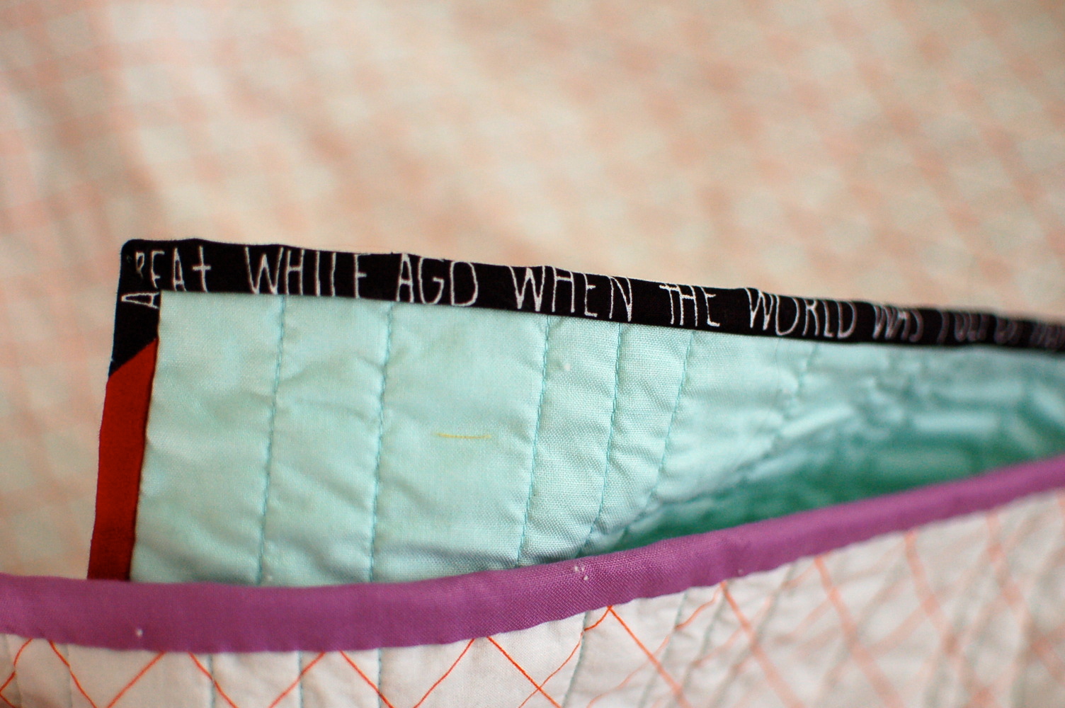 At 68 x 70 inches, the plan for this one is the bed or the couch. It’s a snuggler, nothing fancy. I’m not totally crazy about the quilting, but I’m OK with it enough to leave it be. I kinda wish I had done some free motion quilting on it rather than straight up parallel lines. There will be other tops to FMQ, though.